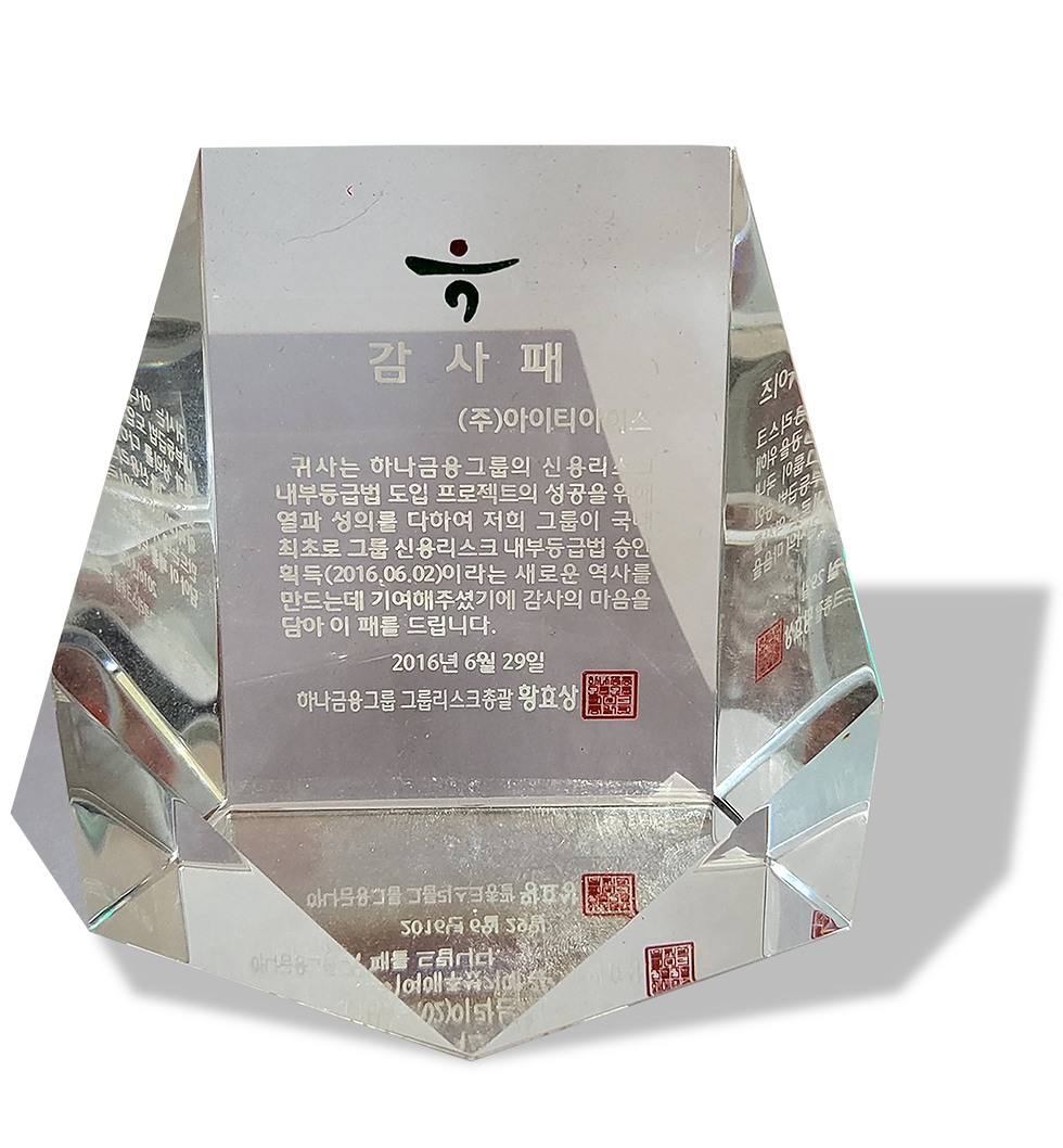 귀사는 하나금융그룹의 신용리스크 내부등급법 도입 프로젝트의 성공을 위해 열과 성의를 다하여 저희 그룹이 국내 최고로 그룹신용리스크 내부등급법 승인획득(2016.06.02)이라는 새로운 역사를 만드는데 기여해주셨기에 감사의 마음을 담아 이 패를 드립니다.